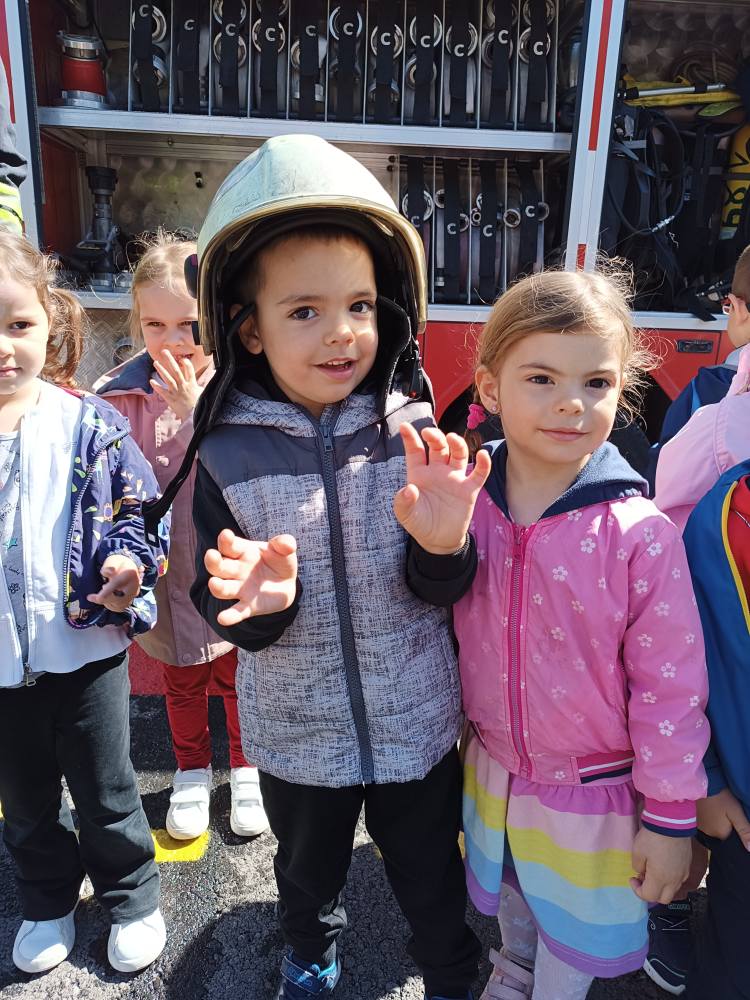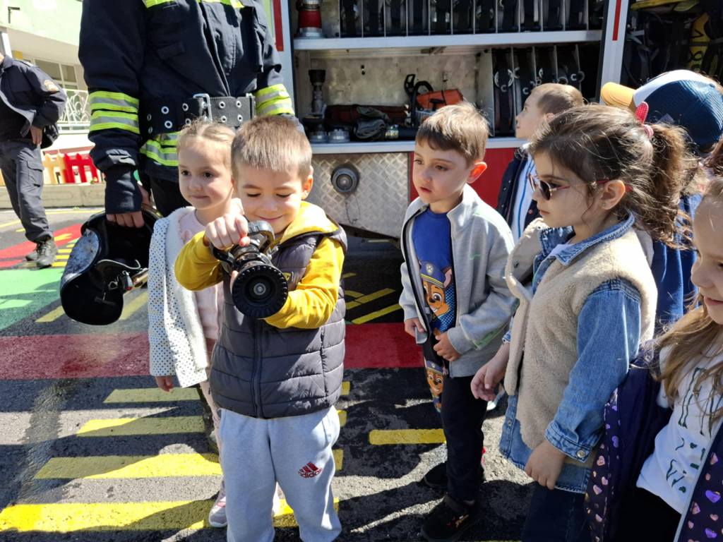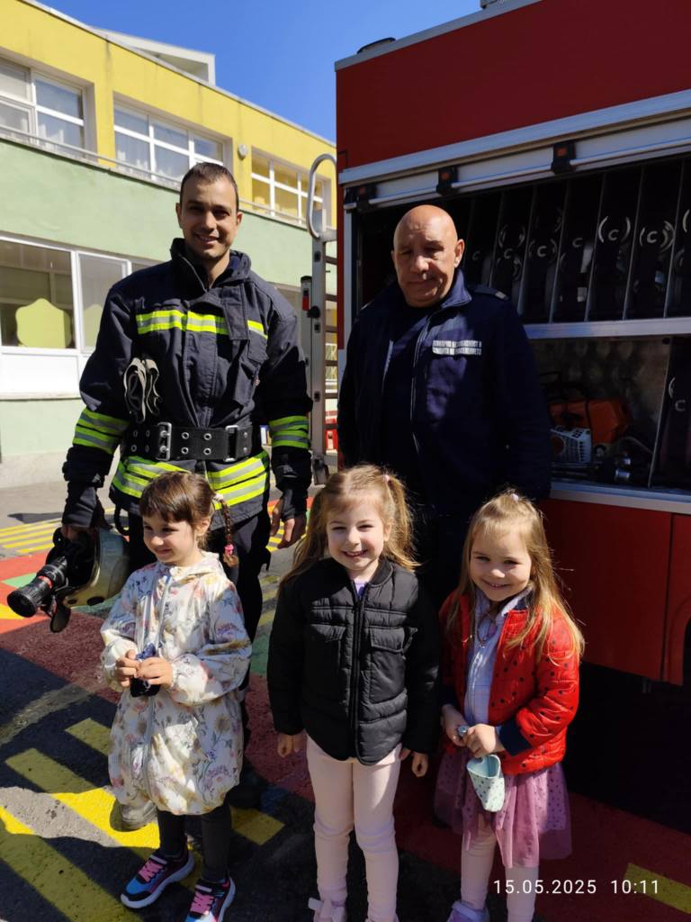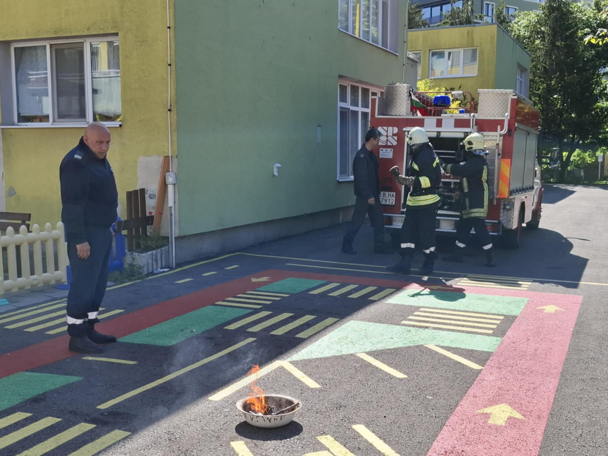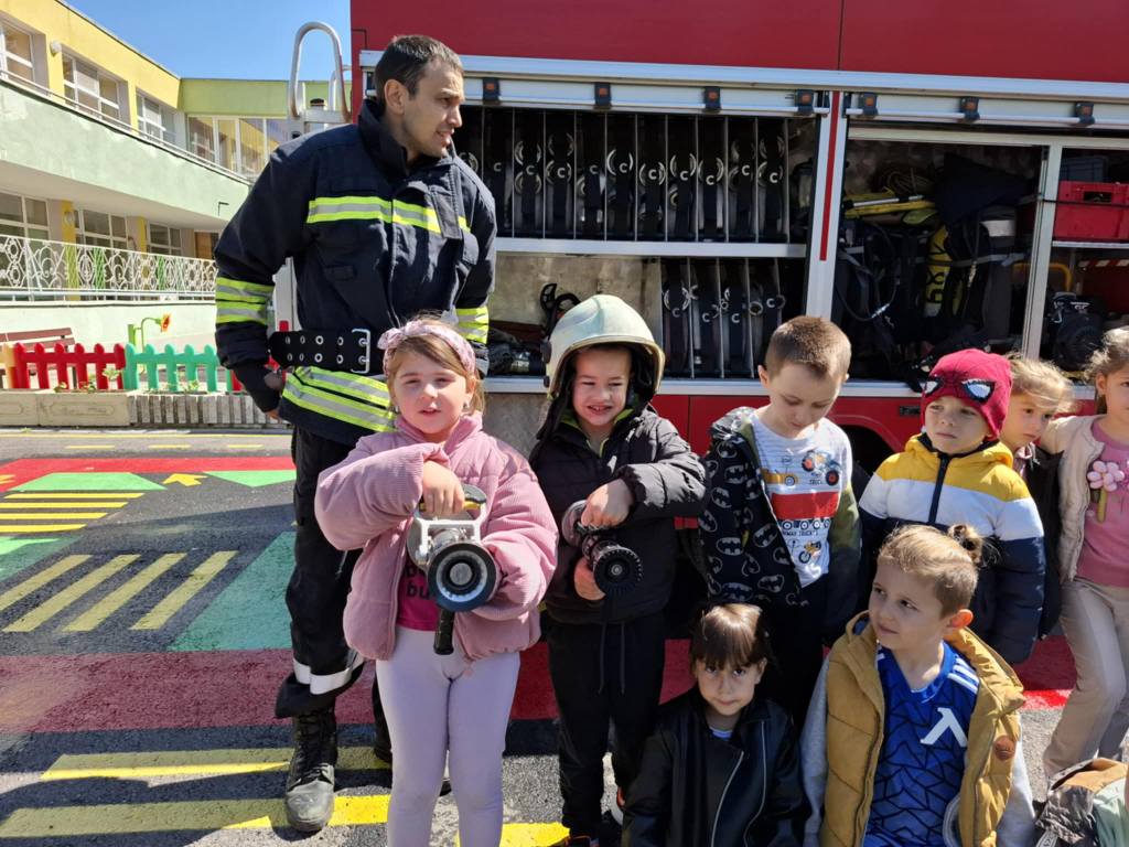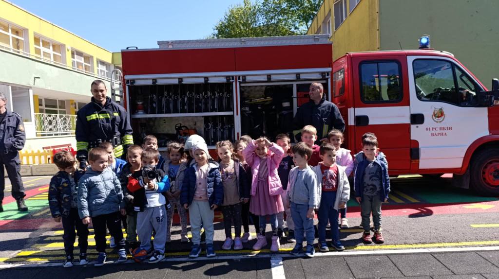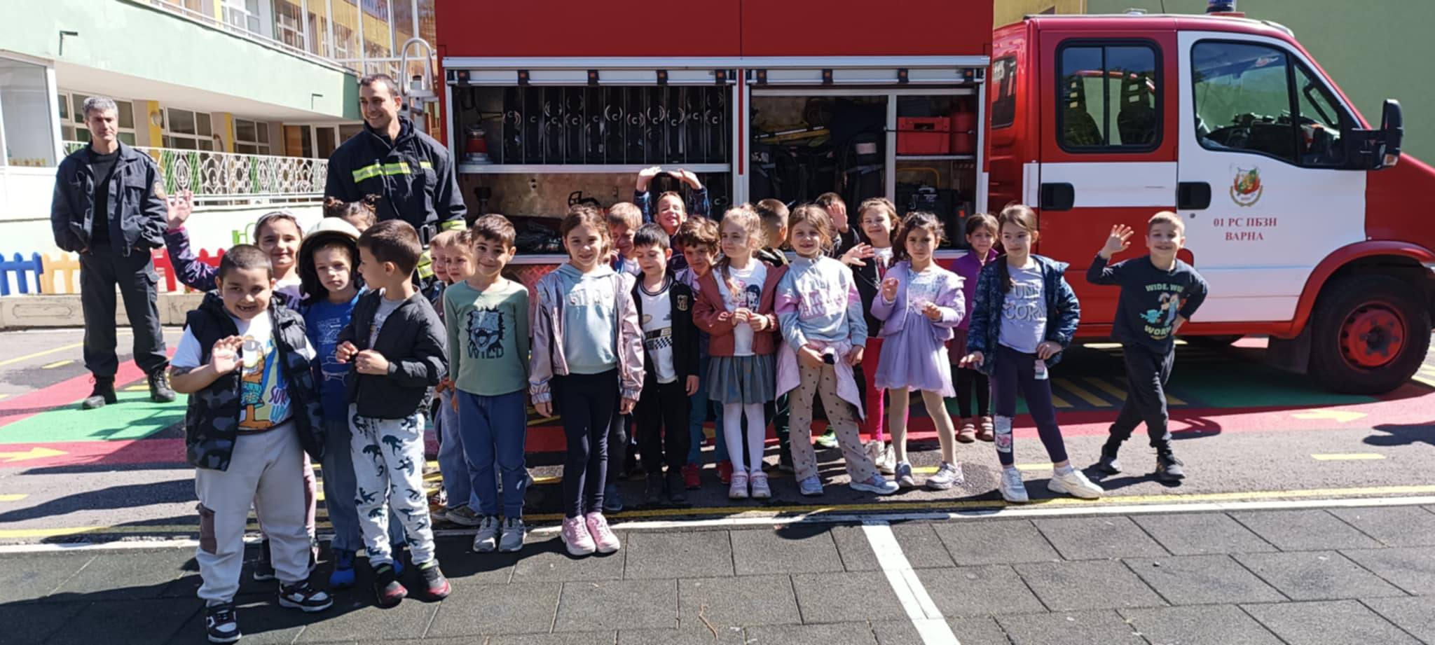 Децата присъстваха на демонстрация по гасене на пожар и спасяване на хора в горяща сграда. Докоснаха се до пожарникарското оборудване и разгледаха пожарния автомобил. И спечелиха нови приятели – смелите огнеборци.