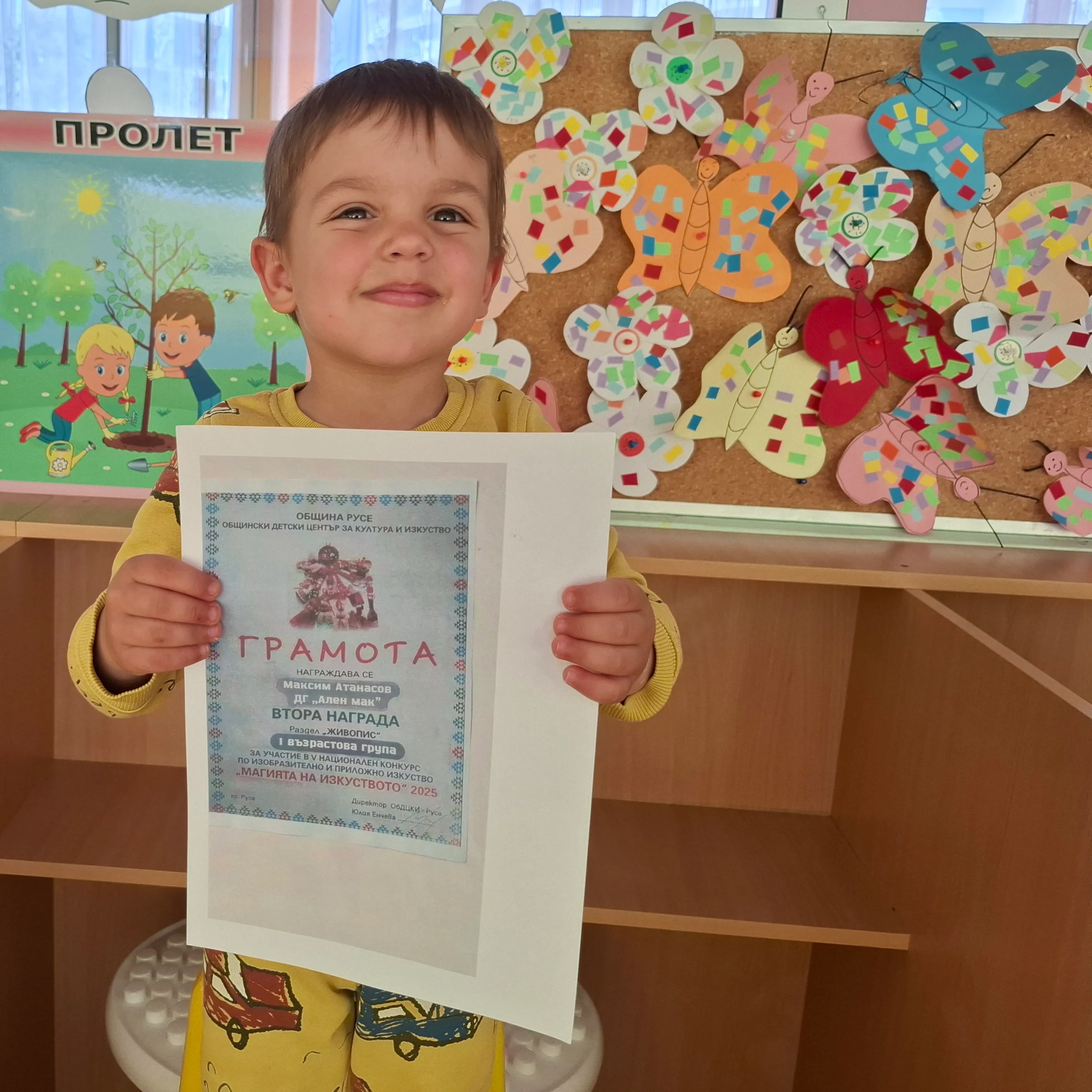 Максим Атанасов от Първа възрастова група спечели втора награда в раздел “Живопис” на пети национален конкурс по изобразително и проложно изкуство “Магията на изкуството” организиран от община Русе